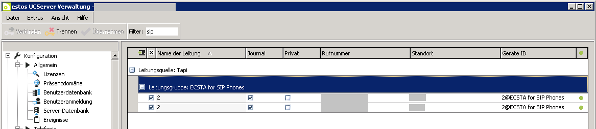 Beispiel Screenshot: UCServer Verwaltung - Leitungsgruppe ECSTA für SIP Phones