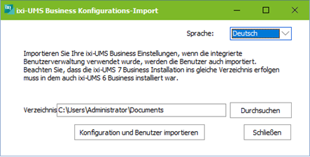 Während der Installation von ixi-UMS 7 Business werden Sie gefragt, ob eine vorhandene Konfiguration importiert werden soll.