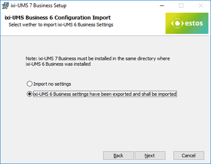 Wählen Sie die Option „ixi-UMS 6 Business settings have been exported and shall be imported“ aus und fahren Sie mit dem Setup fort.