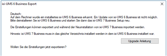 Sie erhalten die Information, dass ixi-UMS 6 Business installiert ist und die Einstellungen exportiert werden können.