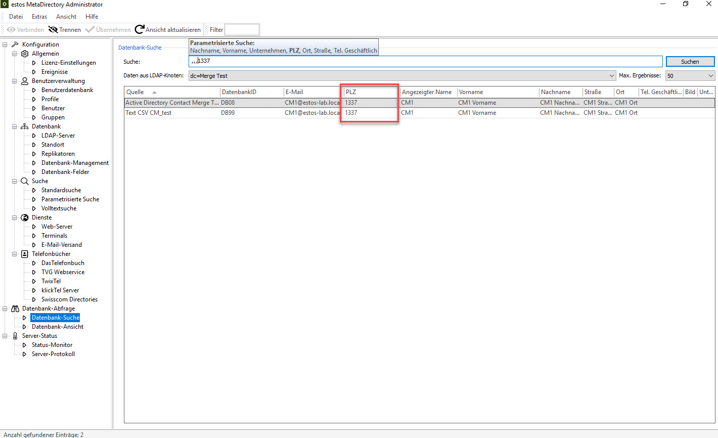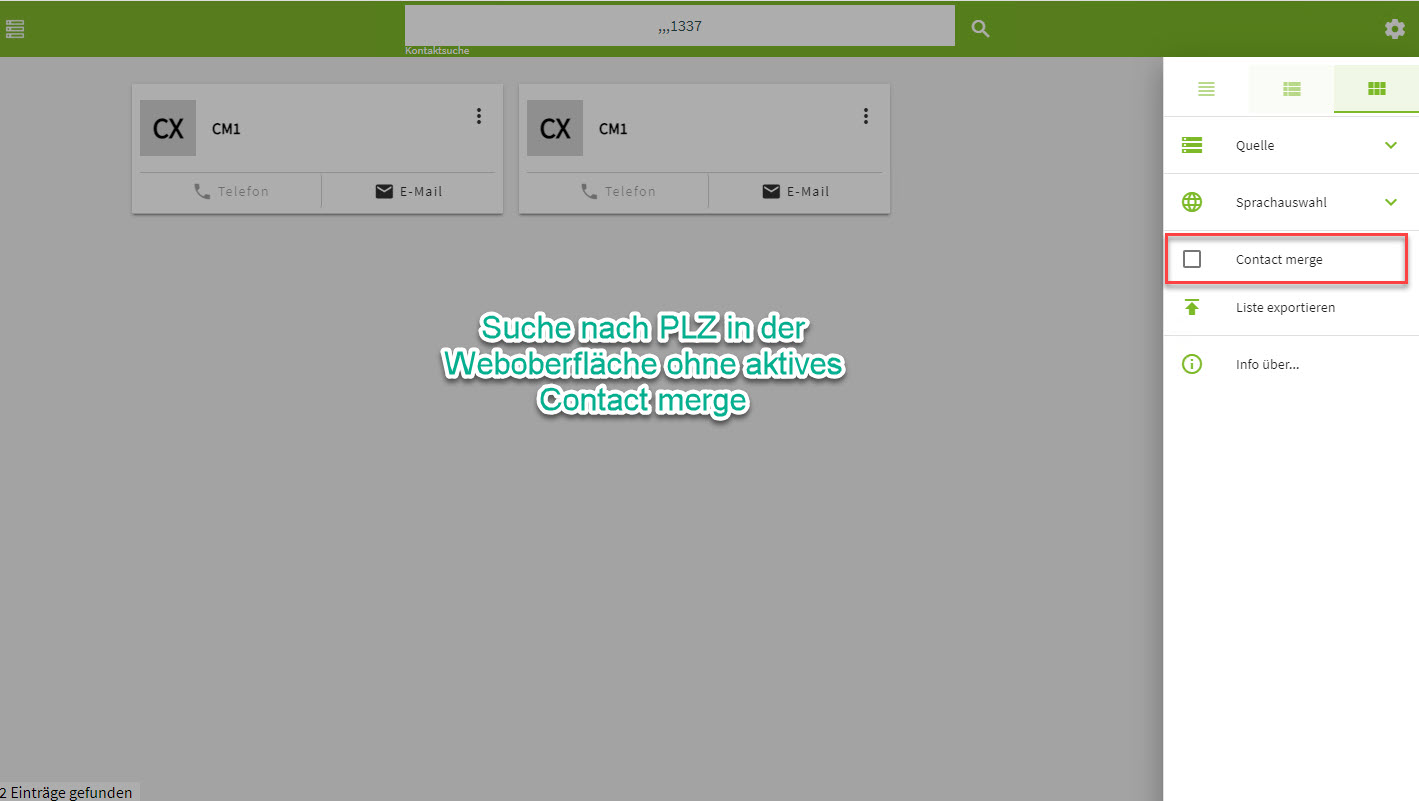 Beispiel Screenshot: Suche nach PLZ in der Web-Oberfläche - mit aktivem Contact Merge