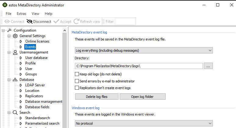 In estos MetaDirectory Administrator wählen Sie den Menüpunkt Konfiguration - Allgemein - Ereignisse