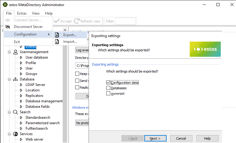 Hierzu wählen Sie in estos MetaDirectory Administrator den Menüpunkt Datei - Konfiguration - Export... und exportieren die Konfigurationsdaten in eine ZIP-Datei, welche Sie zusammen mit dem ZIP-Archiv mit den Logdateien bereitstellen