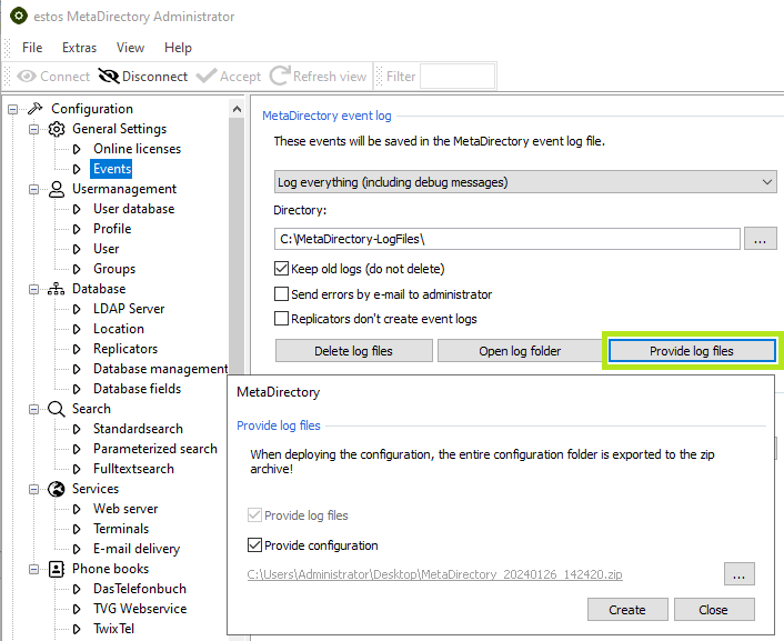 An einem zu spezifizierenden Ablageort wird ein ZIP-Archiv mit den verfügbaren Logdateien erstellt. Konfigurationsdaten bereitstellen bietet zusätzlich die Möglichkeit, auch die estos MetaDirectory Konfigurationsdaten diesem ZIP-Archiv hinzuzufügen, womit der gesonderte im Folgeabschnitt Konfigurationsdaten erläuterte Export der Konfigurationsdaten entfallen kann.