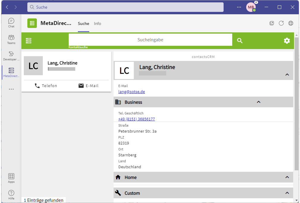 Mit der "MetaDirectory App für Microsoft Teams" können Sie die vom Web-Server des MetaDirectory bereitgestellte Webseite direkt als App in Microsoft Teams einbinden und im Teams Client verwenden.