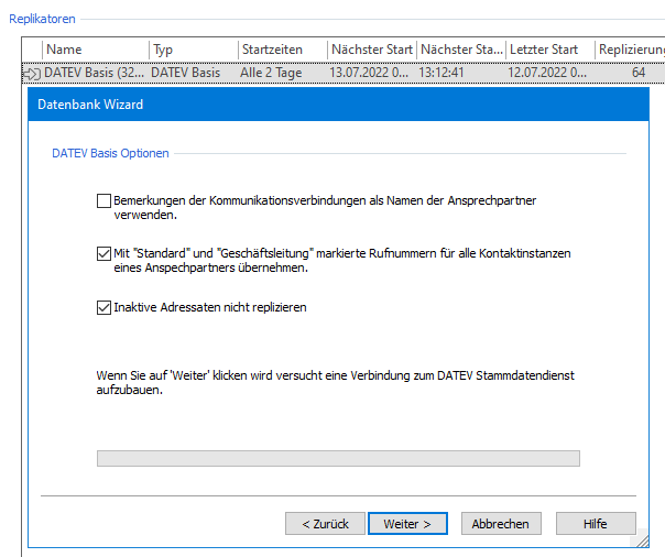 Beispiel Screenshot: Replikatoren - Datenbank Wizard - DATEV Basis Optionen - Inaktive Adressaten nicht replizieren