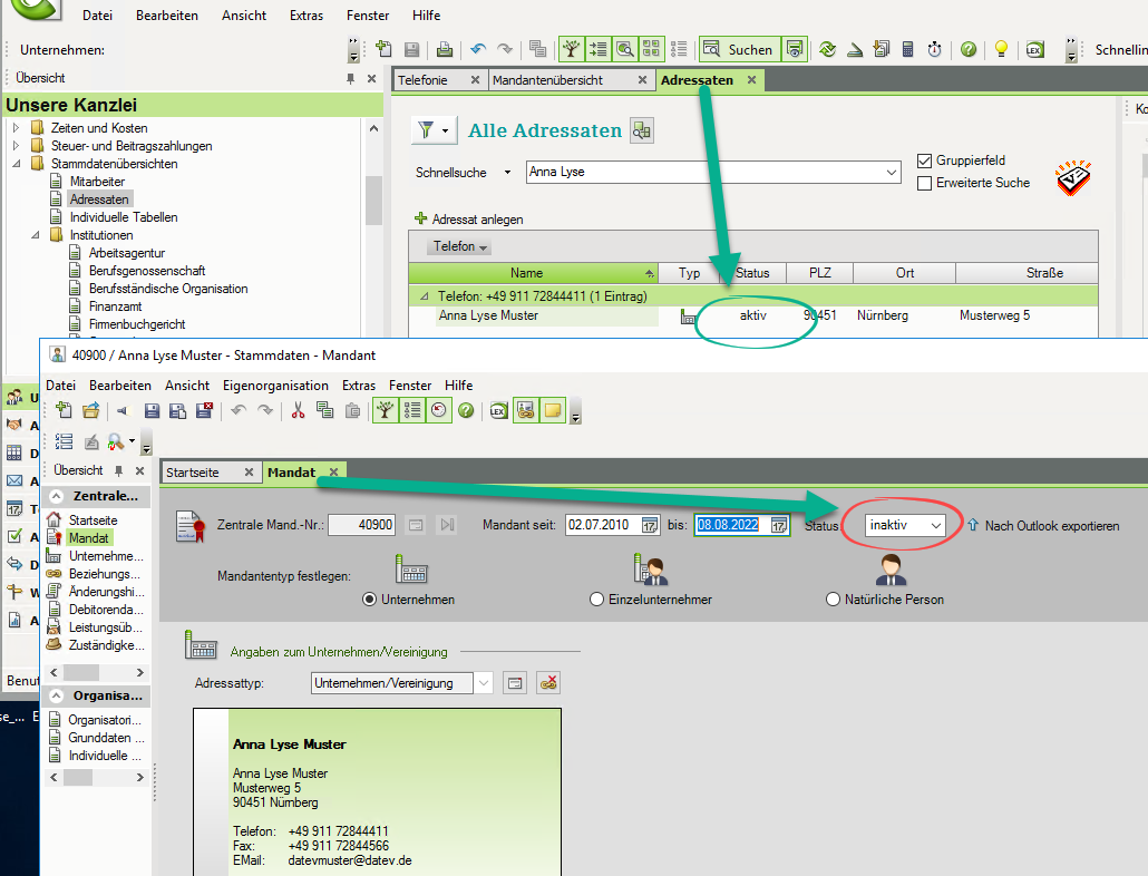 Beispiel Screenshot: DATEV - Stammdatenübersichten - Adressaten aktiv - Mandat inaktiv