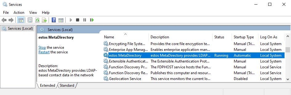 Beispiel Screenshot MetaDirectory Server Dienst unter Services mit der Option "Stop the service"
