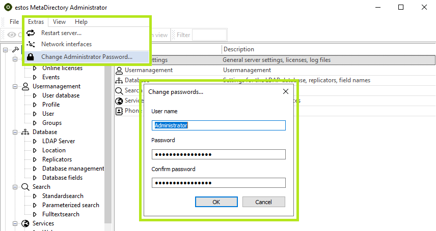 Beispiel Screenshot: estos MetaDirectory Administrator - Administrator Kennwort ändern