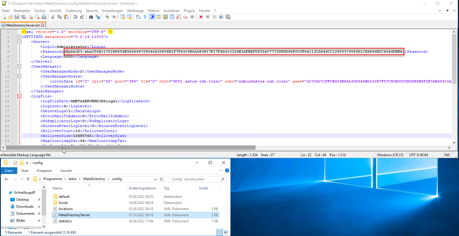 Löschen Sie den Inhalt des Elements Password unter C:\Programme\estos\MetaDirectory\config in der Datei MetaDirectoryServer.xml und speichern Sie die Datei.