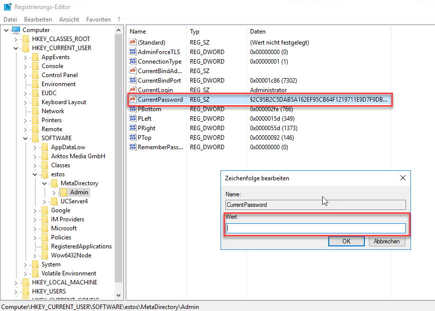 Beispiel Screenshot: Registrierungs-Editor - Computer - HKEY_CURRENT_USER - Software - estos - MetaDirectory - Admin - CurrentPasswort