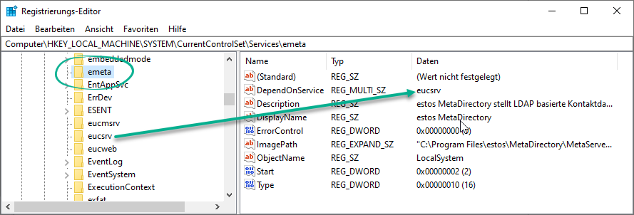 Beispiel Screenshot: Registrierungs-Editor mit Einträgen des MetaDirectory - emeta - DependOnService - eucsrv
