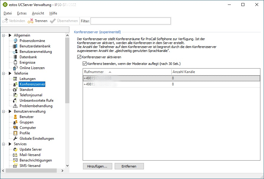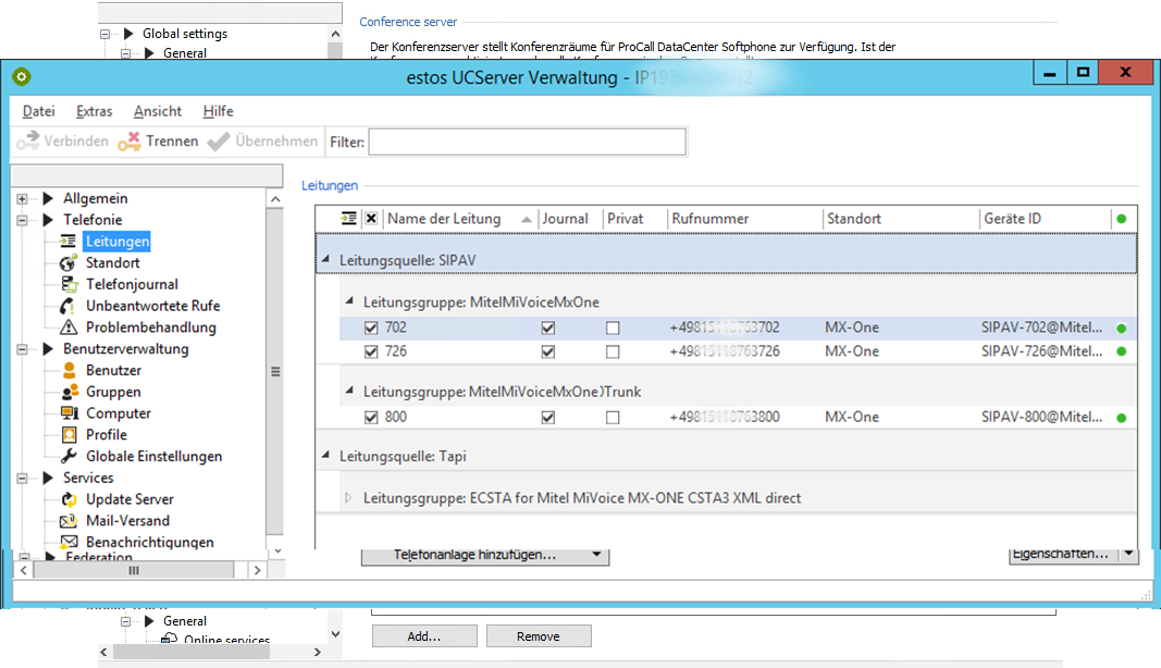 Beispiel Screenshot: UCServer Verwaltung - Telefonie - Konferenzserver - Konferenzserver aktivieren - Leitungen auswählen