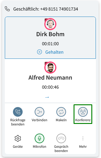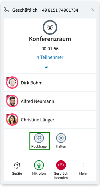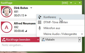 Eine Konferenz können Sie wie bisher im Gesprächsfenster aus einer Rückfrage heraus starten: