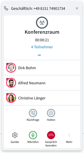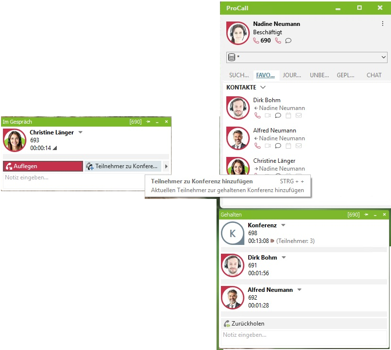 Der Moderator kann aus dem ProCall Fenster heraus weitere Teilnehmer über einen parallelen Anruf anrufen und dann zur Konferenz hinzufügen. Auch ein eingehender Ruf kann der Konferenz hinzugefügt werden.