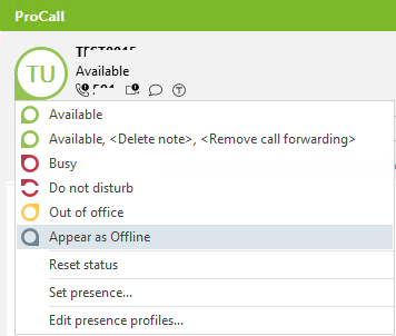 Auch wenn Sie Ihren Präsenzstatus auf "als offline anzeigen" gesetzt haben, können Sie in diesem Status weiterhin alle Funktionen von ProCall nutzen (z. B. telefonieren, angerufen werden, chatten).