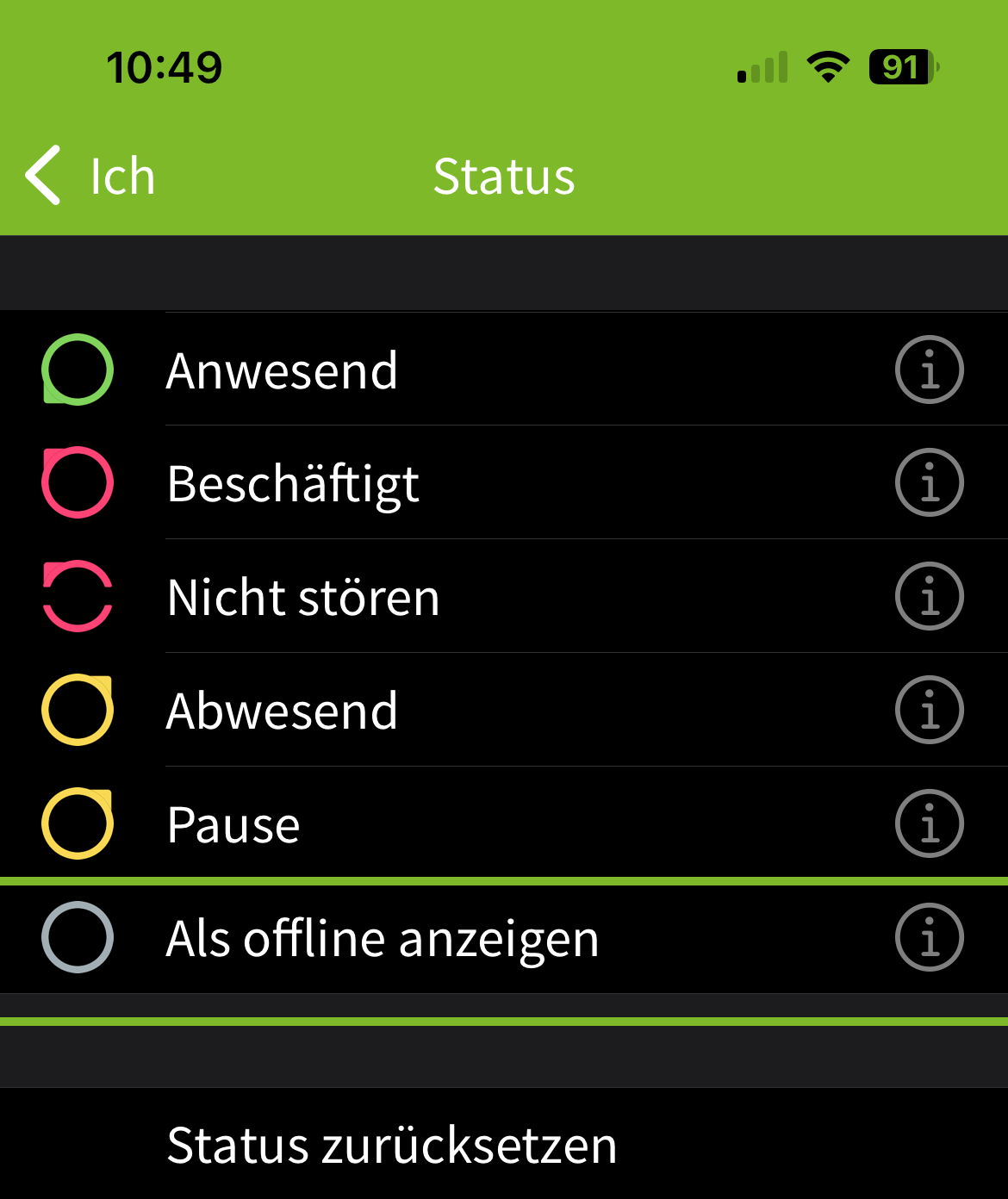 Sie können den Status in ProCall Web,ProCall Desktop for Windows sowie in ProCall Mobilemanuell auswählen, er ändert sich nicht automatisch. Sobald Sie einen anderen Präsenzstatus wählen oder auf "Status zurücksetzen“ gehen, ist der Präsenzstatus "als offline anzeigen" nicht mehr aktiv.