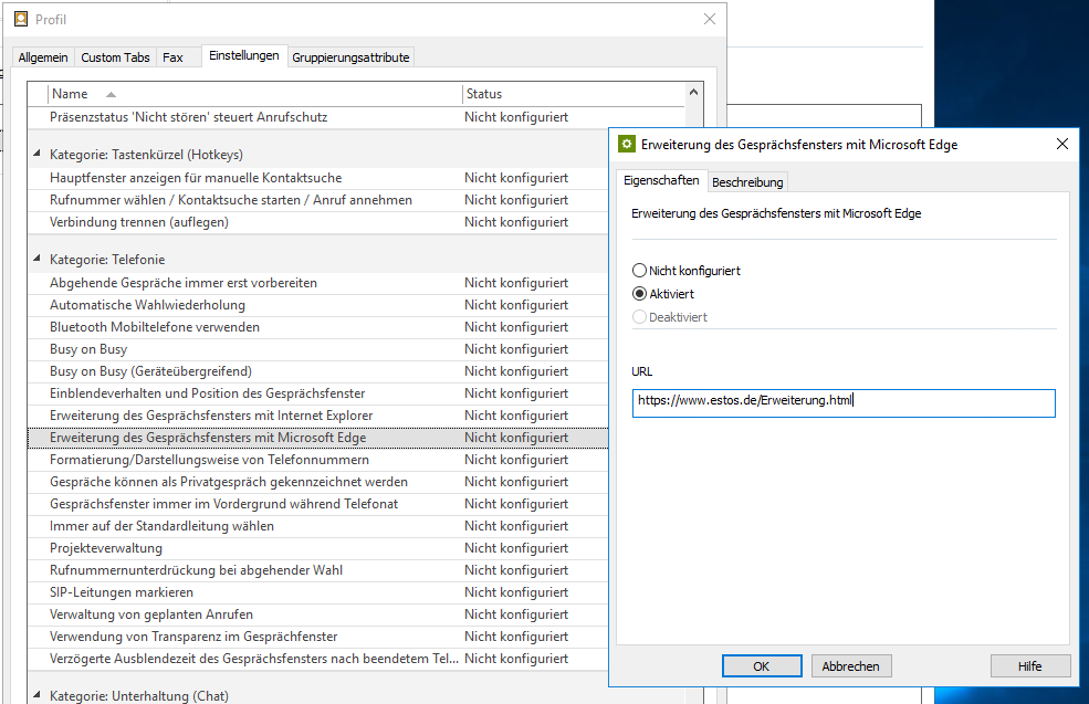 Beispiel Screenshot: UCServer Verwaltung - Profil - Einstellungen - Kategorie: Telefonie - Erweiterung des Gesprächsfenster mit Microsoft Edge - Aktivierung und URL