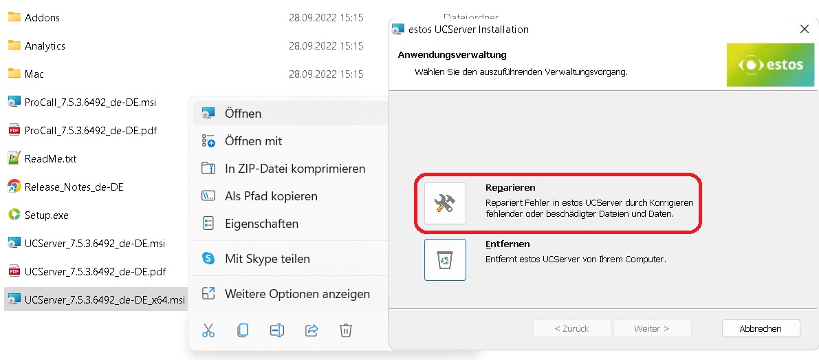 Falls diese Datei nicht verfügbar ist, führen Sie bitte eine Reparaturinstallation durch, indem Sie das estos UCServer Setup erneut ausführen und hierbei die Option Reparieren wählen: