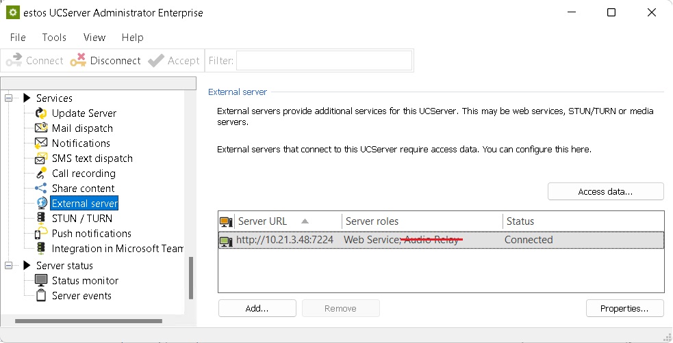In der estos UCServer Verwaltung unter Services - Externe Server wird in der Spalte Server Rollen nur die Rolle Web Service angezeigt, die Rolle Audio Relay wird in dieser Spalte nicht aufgelistet.