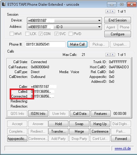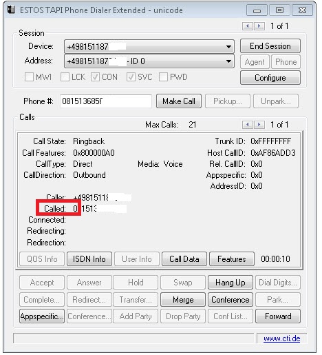 Mit einem Tool wie bspw. Ephone.exe "Nutzung des TAPI Test Tools (ePhone.exe)" würde die Rufnummer wie folgt angezeigt werden: (Bsp. 89xxxx) oder bei vorhandener Amtsholung (Bsp. 089xxxx)
