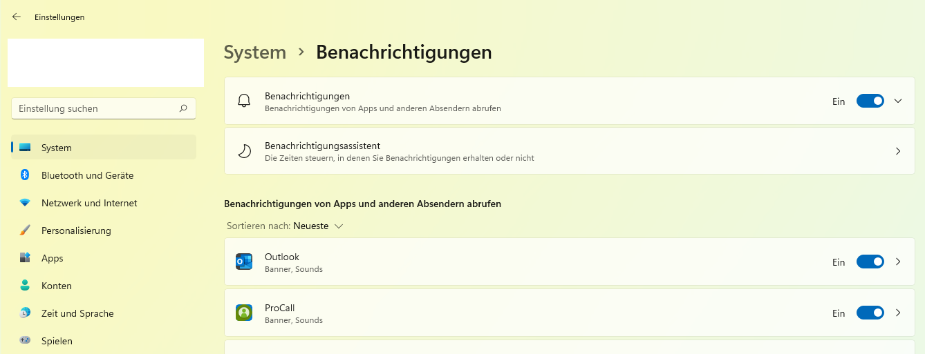 Beispiel Screenshot: Benachrichtigungen für ProCall über Windows Systemeinstellungen einrichten