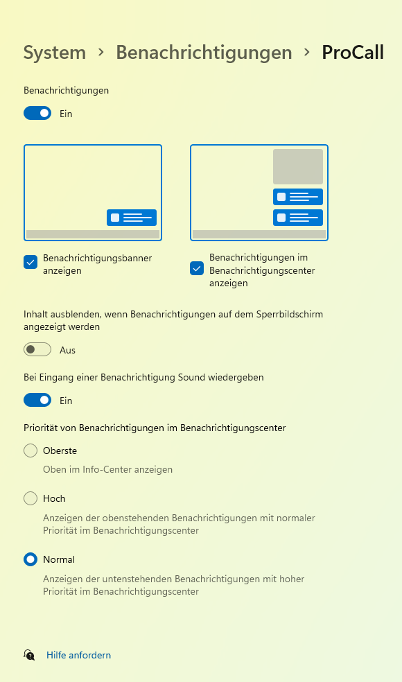 Beispiel Screenshot: Windows Systemeinstellungen - System - Benachrichtigungen - ProCall - Benachrichtigungsbanner, Benachrichtigungscenter, Sound, Priorität einstellen