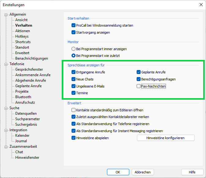 ProCall Client für Windows - Einstellungen - Allgemein - Verhalten - Sprechblase anzeigen für...
