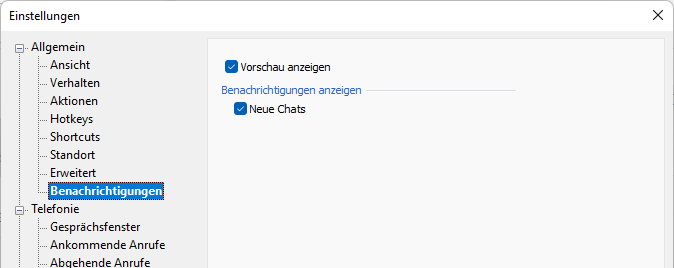 ProCall Client für Windows - Einstellungen - Allgemein - Benachrichtigungen für Neue Chats - mit oder ohne Vorschau
