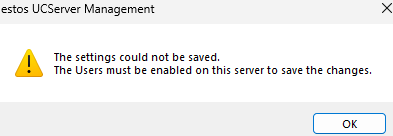 - "The settings could not be saved. The Users must be enabled on this server to save the changes."
