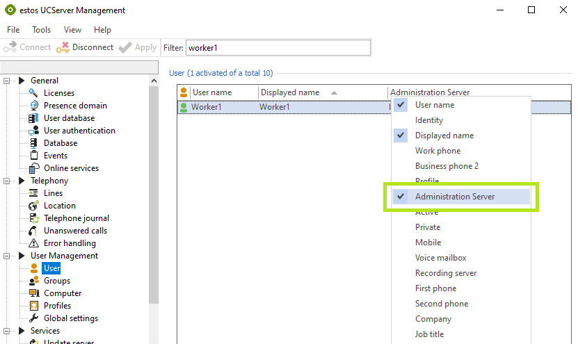 Sollte in der UCServer Verwaltung unter Benutzerverwaltung → Benutzer die Spalte „Verwaltungsserver“ nicht angezeigt werden, klicken Sie mit der rechten Maustaste auf die Spaltenüberschriften und wählen Sie im erscheinenden Kontextmenü die Spalte „Verwaltungsserver“ zur Anzeige aus.