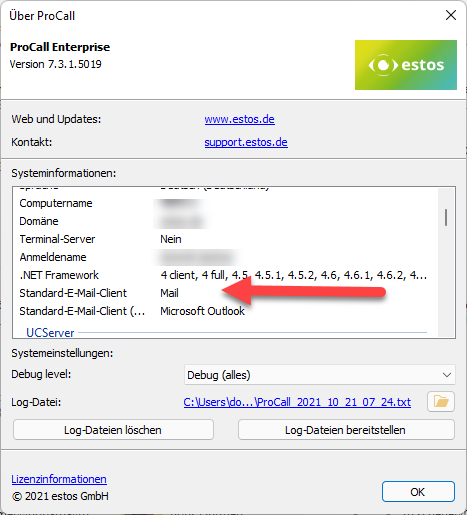 Beispiel Screenshot ProCall Client für Windows - Experten-Ansicht und definierter Standard-E-Mail-Client