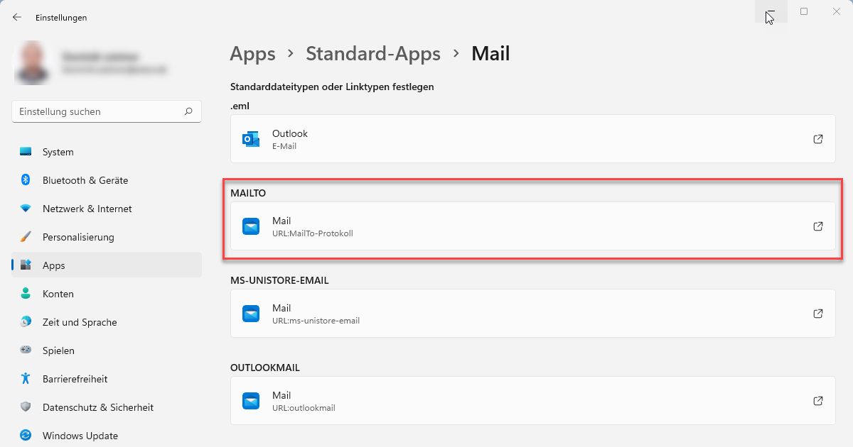Beispiel Screenshot für Microsoft Windows 11 - Einstellungen: Apps > Standard-Apps > Mail - MAILTO