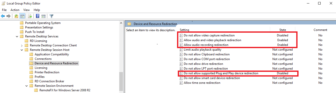 Computer Configuration\Administrative Templates\Windows Components\Remote Desktop Services\Remote Desktop Session Host\Device and Resource Redirection