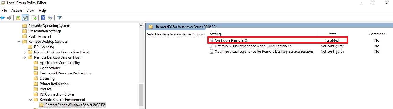 Beispiel Screenshot: Local Group Policy Editor - RemoteFX