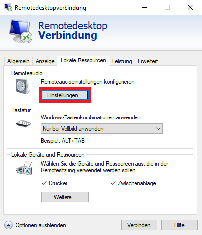 Lokale Ressourcen >> Remote Audio >> Einstellungen...
