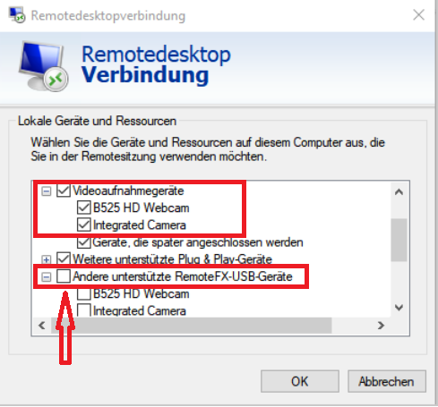 Auf dem Client (Remote Desktop Client) muss die Umleitung für lokal verbundene USB-Geräte (in diesem Fall die WebCam) aktiviert werden.