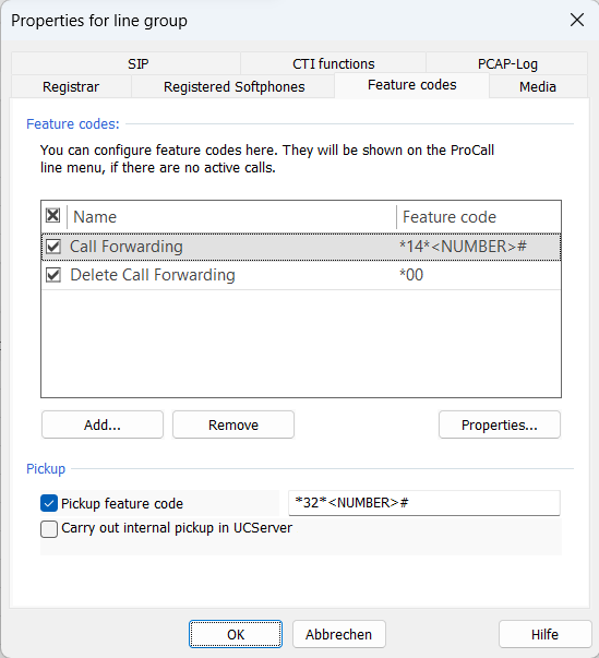 Beispiel Screenshot: UCServer Verwaltung - Telefonie - Leitungen - Eigenschaften für Leitungsgruppe - Feature-Codes - Pickup
