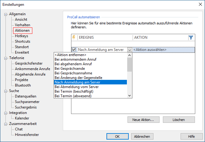 Öffnen Sie die Einstellungen des ProCall Clients und öffnen Sie den Menüpunkt Aktionen.