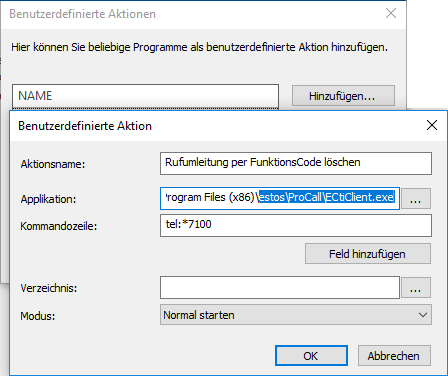 Beispiel Screenshot: ProCall Client für Windows - Benutzerdefinierte Aktionen - Aktionsname Rufumleitung per Feature Code löschen