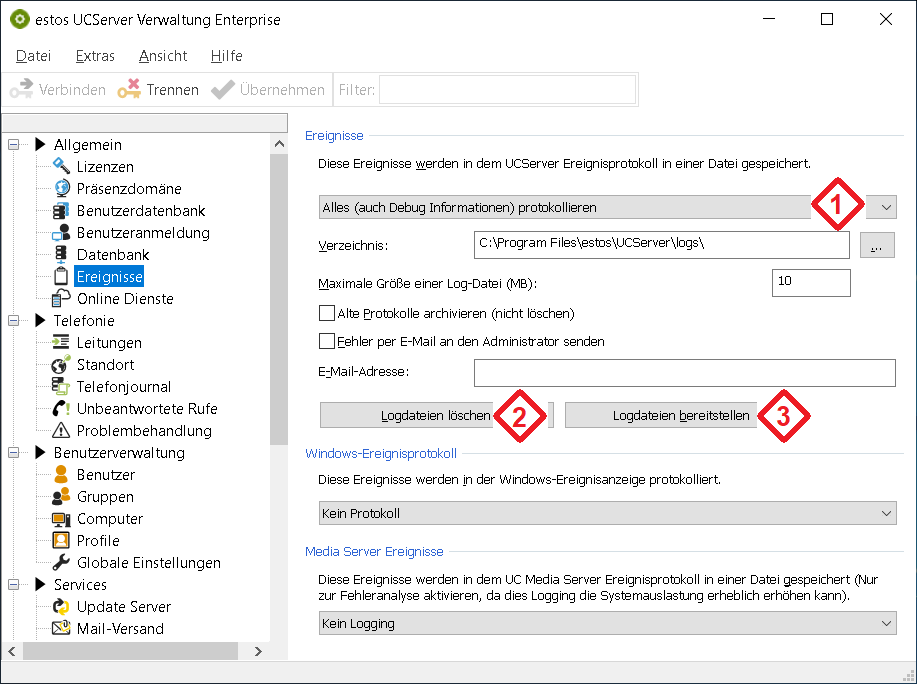 Bitte beachten Sie, dass die Funktion Logdateien bereitstellen im Remote-Betrieb der estos UCServer Verwaltung nicht zur Verfügung steht.