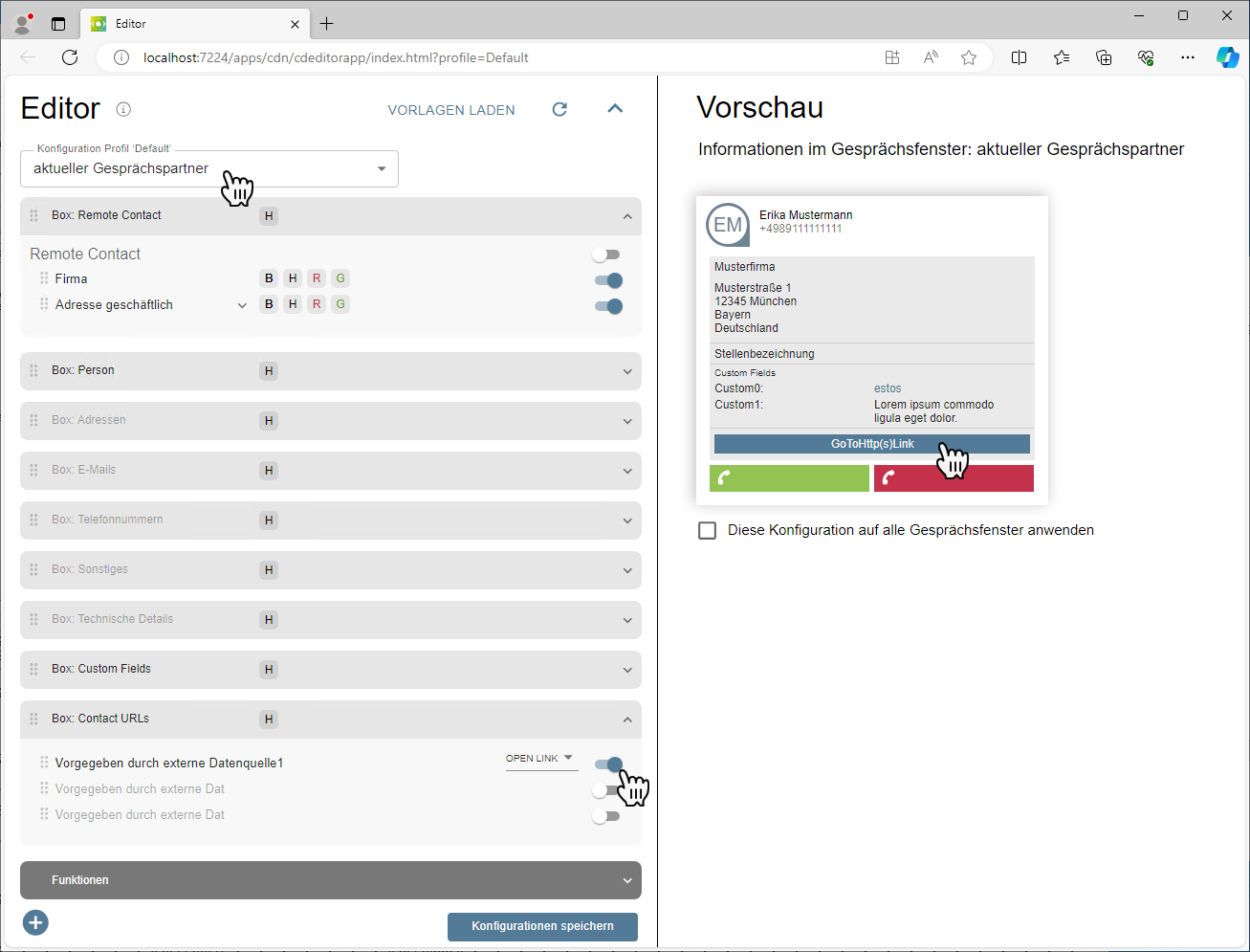 Hierzu ist lediglich im Profil, welches dem ProCall Benutzer zugewiesen ist, über Editor starten unter aktueller Gesprächspartner in der Box: Contact URLs die erste der drei URLs zu aktivieren.