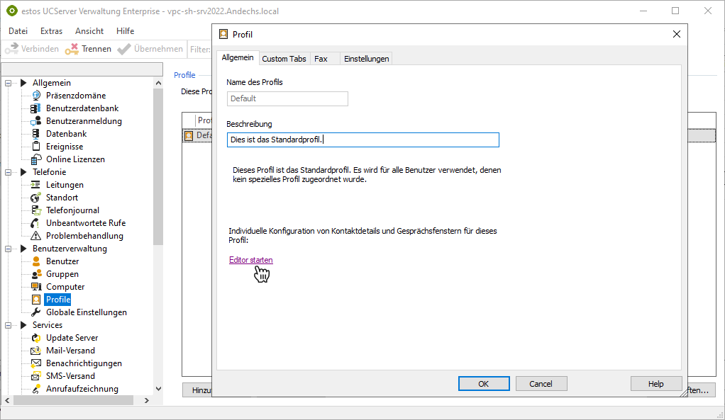 Beispiel Screenshot: UCServer Verwaltung - Benutzerverwaltung - Profile - Aufruf des Editors