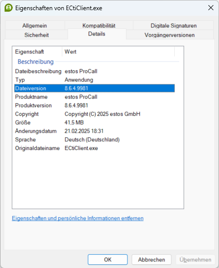 Beispiel Screenshot - Eigenschaften von ECtiClient.exe mit Dateiversion: