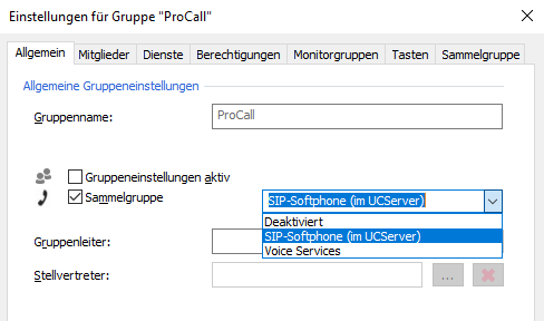 Für Sammelgruppen, denen eine Leitung aus den ProCall Voice Services zugeordnet werden sollen, wählen Sie unter "Allgemein" die Option " Voice Services" aus.
