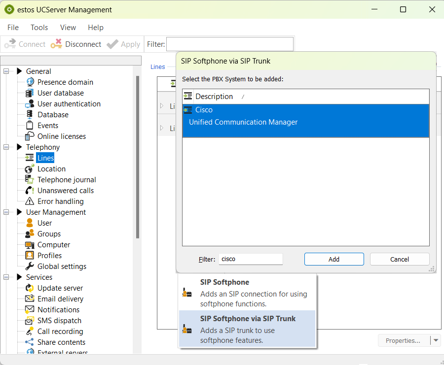 Ab ProCall 8.5 kann ein Cisco Unified Communications Manager (UCM) mittels SIP-Trunk an den estos UCServer angebunden werden, um den Benutzern Softphone-Funktionen (SIP) für ProCall 8 Enterprise zur Verfügung zu stellen.