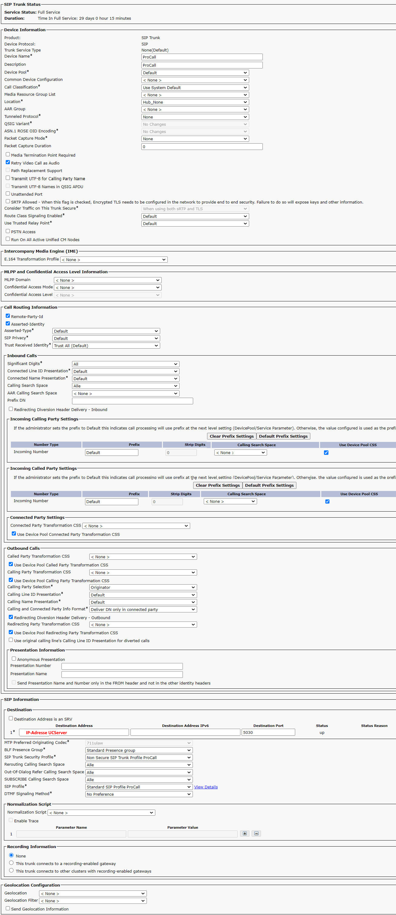 Nach Erstellung der beiden Profile wurde der SIP-Trunk eingerichtet.