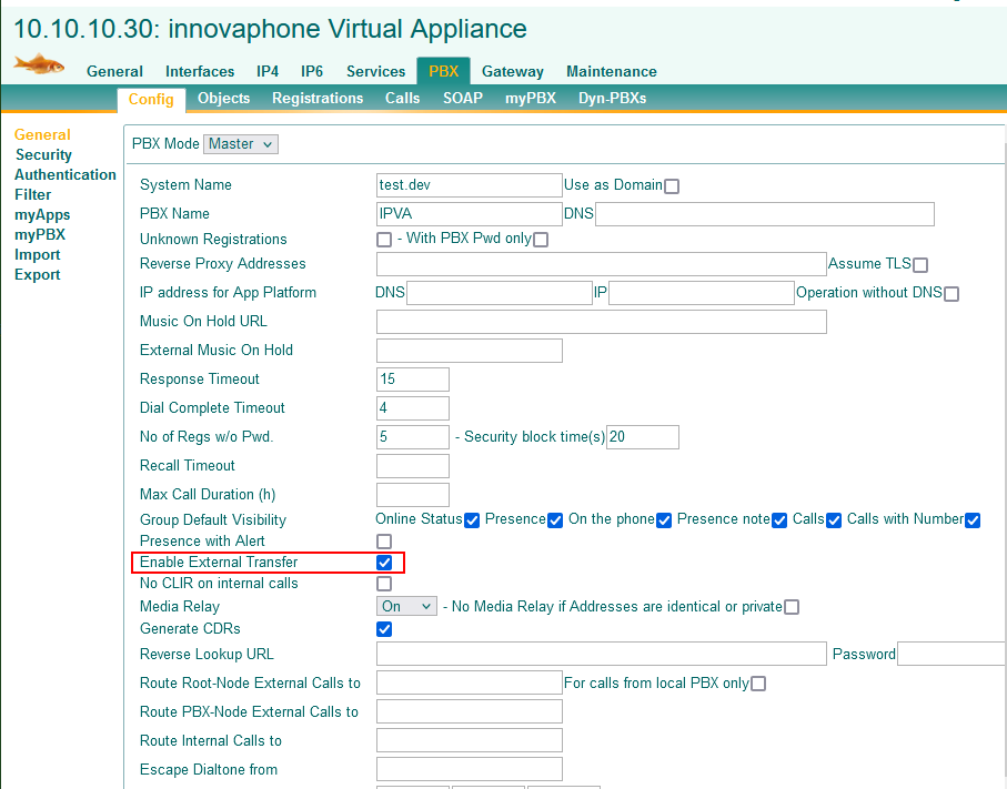 Beispiel Screenshot innovaphone Virtual Appliance - General - PBX - Config - Master - Enable External Transfer