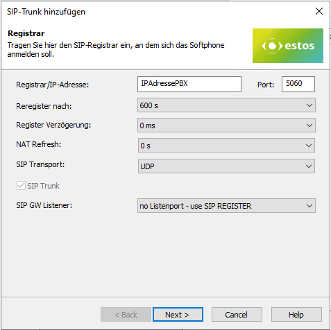 Beispiel Screenshot: SIP-Trunk hinzufügen - Registrar/IP Adresse angeben
