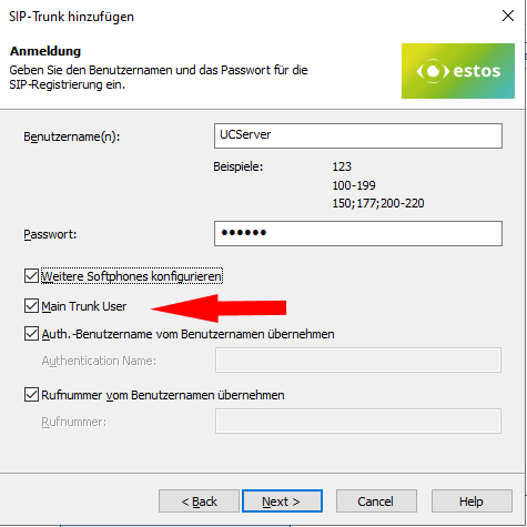 Beispiel Screenshot UCServer - SIP-Trunk hinzufügen - Name und Passwort - Anmeldung als Main Trunk User